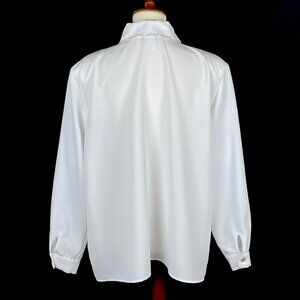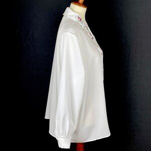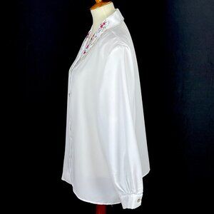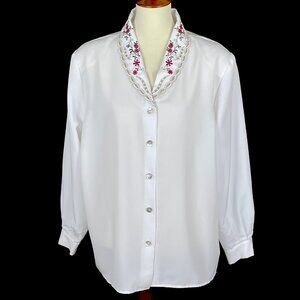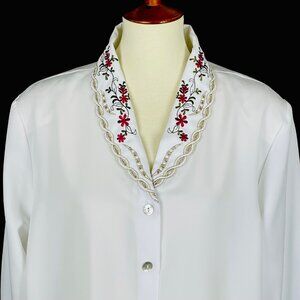Vintage 1980's/1990's Lauren Lee shawl collar full button top in size 20W. Snow white accented with delicate floral embroidery, openwork "lace" embroidery, and shell buttons. Made in the USA of 100% polyester. Measures 27" armpit to armpit, 25.5" neck to tail, 24" sleeve. Excellent condition with no holes, tears, stains, or ripped seams. Smoke free, pet friendly home.