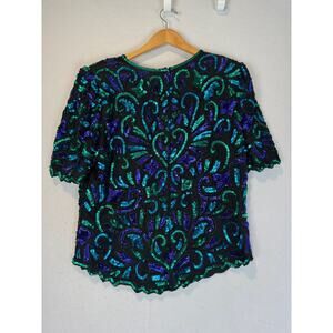 Vtg Laurence Kazar Beaded Top Green Purple Womens Size 1X Silk Classic City