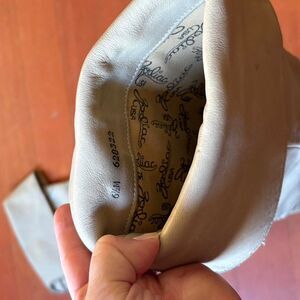 Some light scuffing present along base of shoe exterior, and some mild discoloration on the top flap, which is hard to see in the photos.