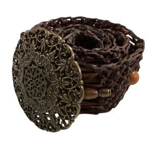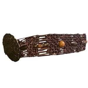 Vtg. Leather Brown Weaved Beaded Hip Hugger Belt Medalion Buckle Hippie Boho