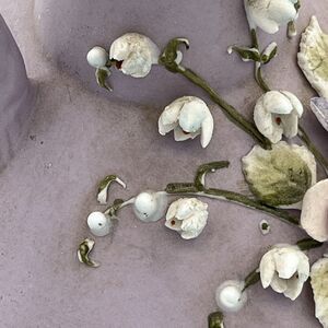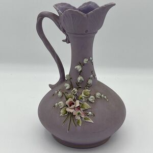 This vintage Lefton purple floral lilac vase features raised applied sweet pea flowers hand painted on a medium-sized vase in an Art Nouveau style. The hand-painted finish adds a touch of elegance to the piece, making it a unique and decorative collectible for any home. this vase showcases intricate floral patterns in a beautiful purple color, perfect for displaying flowers or as a standalone decorative piece. NOTE THIS PIECE NEEDS CLEANING DUE TO YEARS OF DUST BUILDUP. I DID NOT WANT TO RISK DAMAGING THE BEAUTIFUL APPLIED FLOWER BY ATTEMPTING TO CLEAN. THIS IS A BEAUTIFUL DELICATE VASE. WAS IN MY MOTHERS BEDROOM SINCE THE 1960'S.
