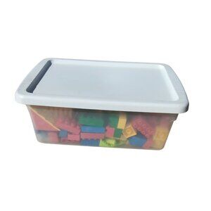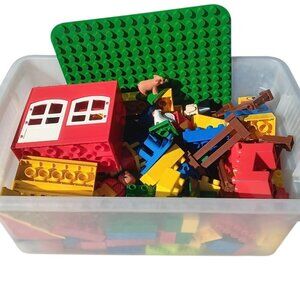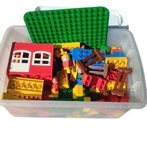 This is a set of Lego Duplo blocks in a tote, featuring various colors and designs suitable for preschool-aged children. These stackable bricks are part of the Duplo LEGO theme, perfect for young builders aged 2 and up. The vintage set includes a bulk lot of DUPLO blocks, making it a versatile and timeless toy for creative play and learning.