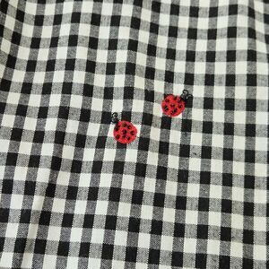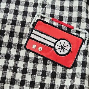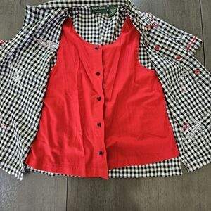 This vintage Lemon Grass Black Gingham Plaid Embroidered Picnic Button-Up Shirt in size small is a novelty item perfect for a casual, 90's themed picnic or BBQ. Made from 100% cotton, this short sleeve shirt features a collared neckline and a red black color scheme. The embroidered accents add a unique touch, making it a stylish and fun addition to any wardrobe. The red tank is sown inside of shirt to make illusion of tank under open shirt. Boxy fit. So adorable for July 4th or BBQ party. Excellent condition. See pictures for measurements
