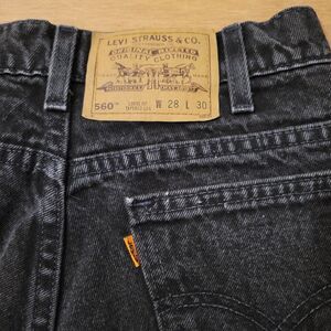 The product is a pair of vintage Levi's 560 black loose fit tapered leg jeans in size 28 X 30. These jeans are made in the USA with the iconic orange tab. The denim fabric is dark wash cotton with a solid pattern and a relaxed fit. It features a mid-rise waist, 5-pocket design, zipper accents, and the Levi's logo. Ideal for all seasons, these versatile jeans are machine washable and have a timeless USA theme. Perfect for a casual yet stylish look, these Levi's 560 jeans are a classic wardrobe staple for men.