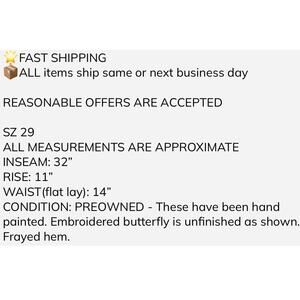 Condition: Preowned - These have been hand painted. Embroidered butterfly is unfinished as shown. Frayed hem.