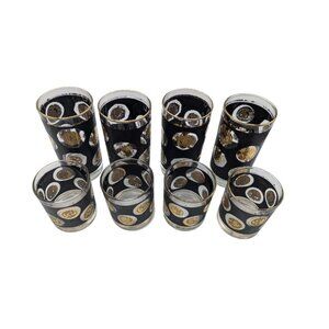 This set of 8 glasses features a striking black and gold Roman coin design. Ideal for enhancing table settings or adding a vintage touch to collections.