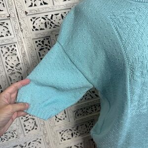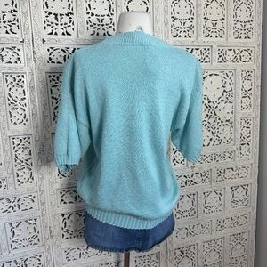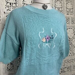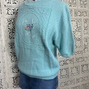 Vtg Light Blue Floral Embroidered Textured Grannycore Short Sleeve Sweater Sz M