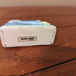Adorable, exquisite porcelain frame from Lilian Vernon Japan. Features a duck with balloons musing on a spring day. Frame itself measures 3.25 inches by 2.75 inches and has an oval space for a photo that's approximately 1.5 inches wide by 1.75 inches tall. In beautiful preowned condition. Material on the back of frame is tearing slightly.