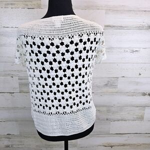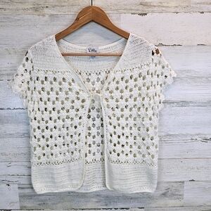Vintage Lilly Pulitzer, crochet cardigan, boho chic, white cover-up, open knit sweater, short sleeve cardigan, coastal grandmother, cottagecore fashion, women's medium, beach cover-up, retro style, preppy aesthetic, summer layering, floral crochet, designer vintage.