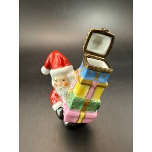 Beautiful Limoges France Christmas Santa Trinket box with hand painted by Rochard. The trinket box is in the top box gift stack. The figurine measures approximately 3” by 1.75” wide.