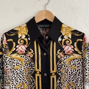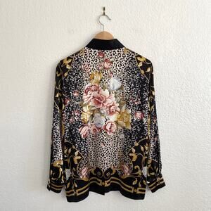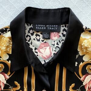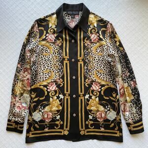 Make a statement in this vintage, late 90’s, Linda Allard for Ellen Tracy silk blouse, featuring an opulent baroque-inspired design with floral and cheetah print details. The bold pattern blends gold scrollwork, multi-color roses, and animal print accents on a rich black base, creating a look that’s both timeless and glamorous. Made from 100% pure silk, this button-up blouse drapes beautifully with a soft sheen and luxurious feel.