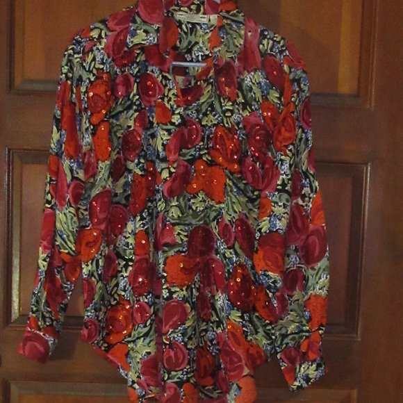 Vtg Long Sleeve Rayon Blouse Sequins Beads Medium