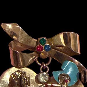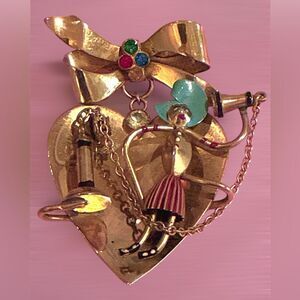 Truly amazing Longcraft figural brooch heart shaped hanging from a bow with colorful crystals in the center. The pin has a woman and a telephone attached with fine chain. The painted details are intact. The pin is circa WWll, and this particular design with the phone, in excellent condition, is extremely rare. The pin measures slightly under 2.5” tall and approximately 2”, wide.