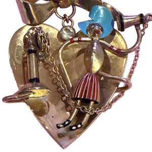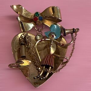 Vtg Longcraft Gold plated 3D Lady Telephone chain heart WW2 figural brooch