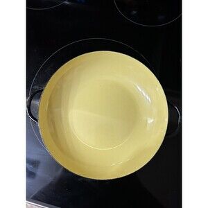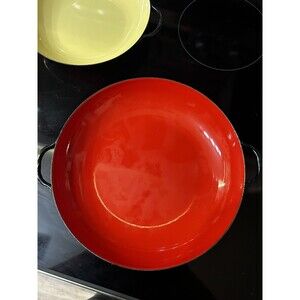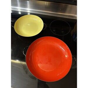 Very good pre owned condition. Red pan is 9.75 across and yellow pan is 8 across. Some wear due to age but overall they are very nice pieces. Ships within 24 hours of payment. Thanks for looking!