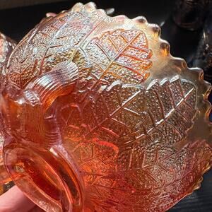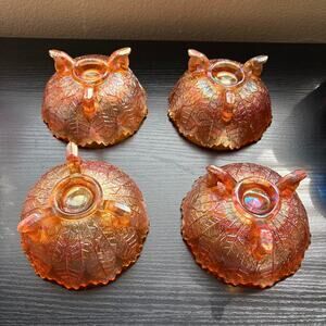 Vtg Lot of 4 Fenton "Leaf Tiers" Berry Bowls Footed Carnival Glass Marigold Iridescent This listing if for a lot of 4 (four) Fenton "Leaf Tiers" Berry Bowls, with three tree bark styled feet. The pattern is on the exterior and the interior is smooth. The have a beautiful iridescent color. Not signed therefore older early 1900s piece.