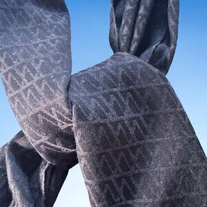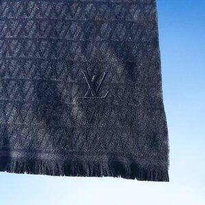 Vtg Louis Vuitton Logo Pattern Wool Scarf, Black/Grey, OS — Authentic vintage Louis Vuitton, good condition. LV repeat logo pattern, black and dark grey, fringe ends, embroidered LV logo on one end. Very soft cashmere feel wool.