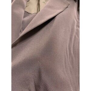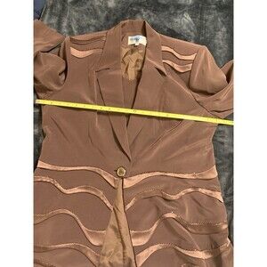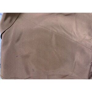 A couple areas have small stains. A pin size hole on the front of the jacket from a name tag. Chocolate brown color. The lighting in some of the pictures distorts the color a bit.