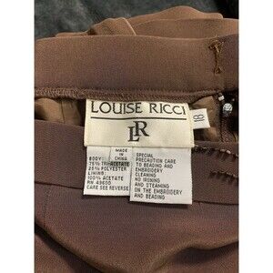 The Louise Ricci Women's Suit is a sophisticated piece of vintage clothing. Chocolate brown color. Size 18. Lined. This suit set includes a skirt and jacket. Jacket is beautifully beaded and embellished.