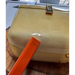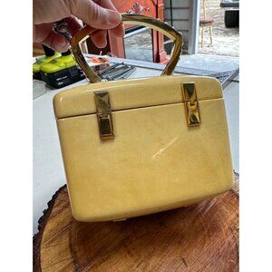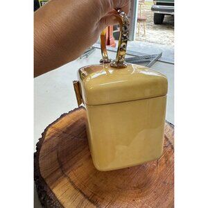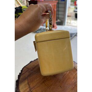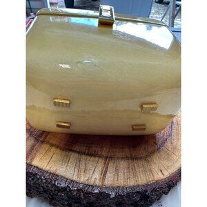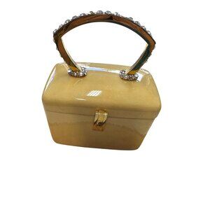 This vintage Lucite box purse showcases a glossy yellow finish, adorned with a rhinestone-accented gold handle and clasp. Its timeless design makes it a distinctive accessory for formal or casual ensembles.