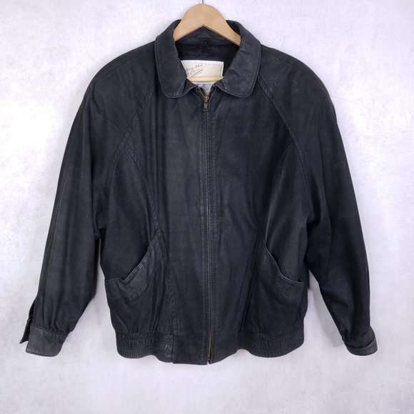 Vtg Luis Alvear "Brass Plum" Womens L Black Leather Bomber Jacket Full Zip Front
