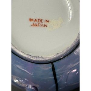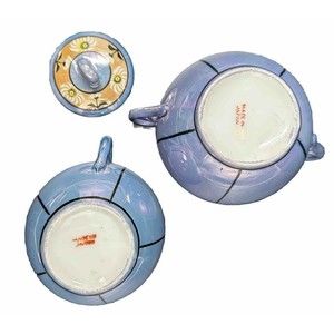 This vintage creamer and sugar set from Japan is a beautiful addition to any collection. The hand-painted floral design is accentuated by the lusterware iridescent finish. Made of bone china, this set is durable and perfect for serving guests. The set includes a lid for the sugar bowl, adding an extra touch of elegance.