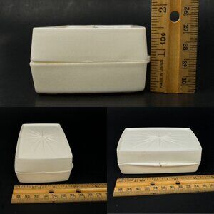 Condition: Gently used vintage condition. Has a light fragrance to it. Some light discoloration/stain/blemish on the outside. Small marking within the plastic material on the outside bottom edge. Hinge works, container "snaps" closed and opens. SEE PHOTOS