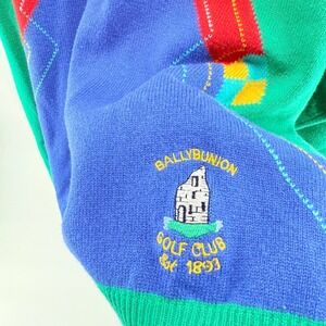 Keywords: Lyle & Scott, Vintage Sweater, Golf Sweater, Argyle Sweater, Lambswool Sweater, Pullover Sweater, Retro Knitwear, Ballybunion Golf Club, Mens Sweater, V Neck Sweater, Colorful Sweater, Vintage Golf Apparel, Scottish Knitwear