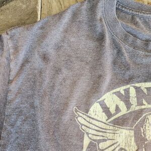 Vintage Lynyrd Skynyrd T-Shirt Size XL ( Extra Large ) Gray Crew Round Neck Pullover Short Sleeve Band Tee With Band Logo And Name Spell Out In White, Southern Rock And Roll Country Music Classic Rock Concert Tee Retro Crossbones With Skull And Wings, Hanes Heavyweight 50/50 Tag.