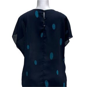 This blouse and skirt set from the 70s-80s exudes timeless elegance with its black and teal print. The semi-sheer top features dazzling black rhinestones and teal faux pearls on the front, complemented by a keyhole back with a three-button closure. The pleated skirt boasts an elastic drop waist for a flattering fit.