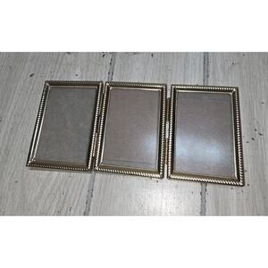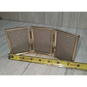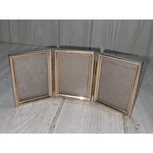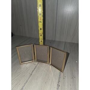 Vtg MCM 5x7 Trifold Embossed Gold-Tone Metal Picture Frame Farmhouse Memories . Condition is Used. Shipped with USPS Ground Advantage.