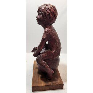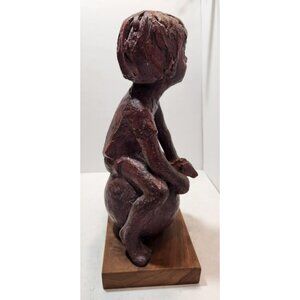 This vintage MCM Austin Productions sculpture features a little boy riding a hoppity horse, making it a charming and unique decorative collectible for any room. The medium-sized brown sculpture is from the late 20th century, specifically the 1970s, and comes in its original matte finish. Made in the United States, this original piece showcases a playful subject and is sure to be a standout addition to any collector's display. Pre-owned by collector. In good condition. One of the felt circles on the bottom of the wood has come off. Please see pictures for details.
