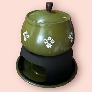 Vintage deep avocado green / olive green fondue pot with wood handle and wood knob/handle on the lid. White daisy decoration all along the exterior. Comes with green base plate, black metal base, and silver alcohol burner.