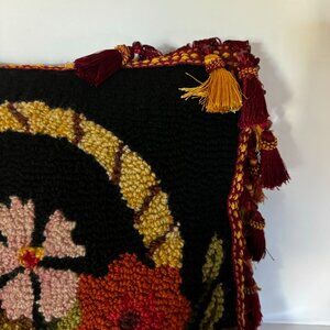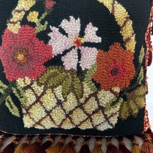 Vtg MCM Hand Hooked Wool Throw Toss Pillow Flower Basket 17x17" Cushion Tasseled