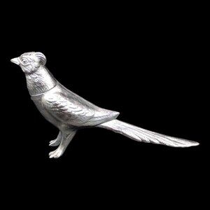 Vintage silver-plated salt and pepper shakers, designed in the style of the 1950s. Shaped like long-tailed pheasants, They add a touch of mid-century modern elegance to any table setting.