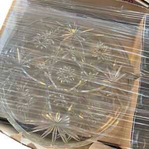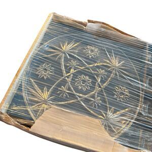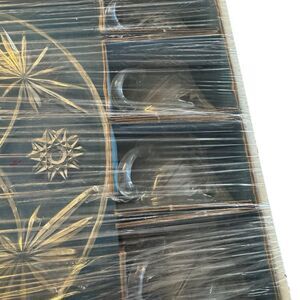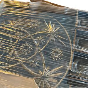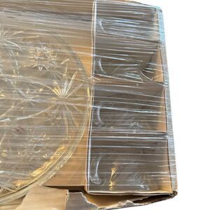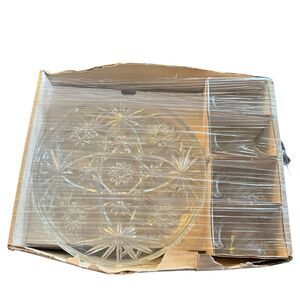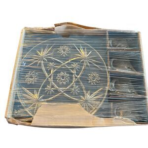 This vintage MCM plate tea cup set by Anchor Hocking features an Early American Prescut design with a star of David pattern. The set includes 8 round pressed glass pieces with a clear color and a glossy finish. Made in the 1960s, this mid-century modern snack set is microwave and dishwasher safe, chip resistant, and decorative. This original production style piece reflects American theme and style, making it a unique and collectible addition to any home.