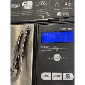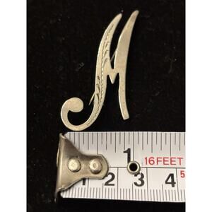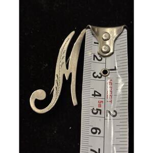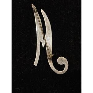 Vintage Sterling Silver initial brooch featuring an etched design on a script letter “M”. It is signed by an unknown maker and marked Sterling. Estimated to be from the 1955-1965 era. 3.57g. Smoke free home