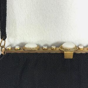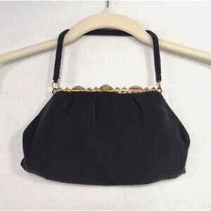 Condition: Good pre-owned vintage condition, however the black beaded fabric is beginning to separate from the gold-toned frame, as pictured in photos. Beading is otherwise largely intact. Minor age/patina on metal frame, consistent with vintage wear. Please see all photos for full details on condition and specific flaws.