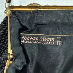 Elegant vintage Michel Swiss Paris bag. Features black glass beads, gold-toned ornate frame with white cabochons. FLAW: Beaded fabric is separating from frame, see photos.
