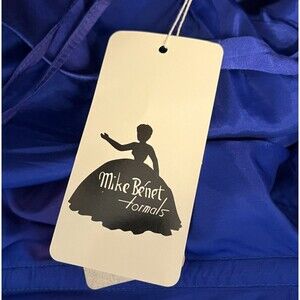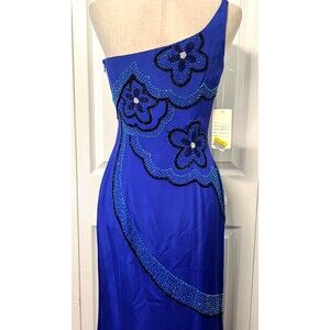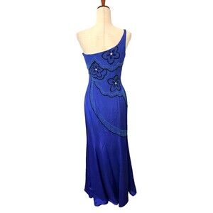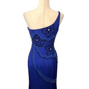 Beautiful royal blow gown by Mike Benet Formals. Made of 100% Silk with polyester lining. Intricately beaded in a floral pattern, that cascades down the side of the dress. Has one shoulder design, with a side zipper closure. Chest has molded padding. Women's size 8.