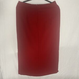* Skirt: Pencil midi style, flat front with elastic back, zipper closure, 12" side slit