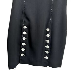 Style Tags: magaschoni, tracy reese, vintage designer, pearl button dress, 90s dress, coquette aesthetic, little black dress, topstitch detail, size 4, classic lbd, cocktail dress, elegant dress, timeless style, designer vintage, sophisticated dress