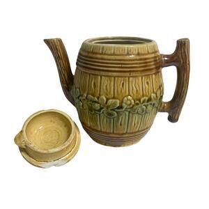 Vtg Majolica Teapot Wooden Barrell Cask Vines 5.25" Tall chipped lid