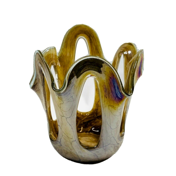 Vintage Makora Krosno Hand Blown Open Vase Iridescent Art Glass Piece Made in Poland