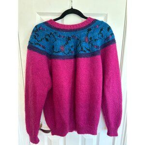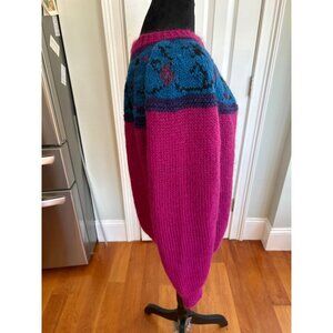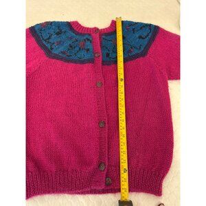 Vtg Manos Del Uruguay Handknit Wool Cardigan Sweater Fuchsia Blue L