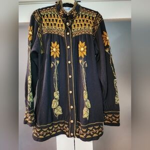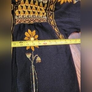 Vtg Maureen Goldie design 100% Pure Wool Sweater with sunflowers, 3D chenille accents, mock neck gold metal rose shaped buttons