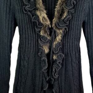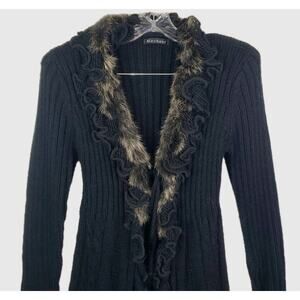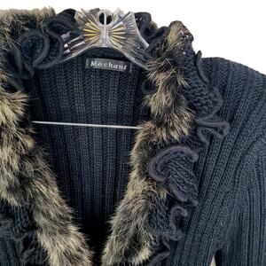 Vtg Mechant Wool Ruffle Fur Trim Open Tie Front Long Wool Cardigan Large Fashion