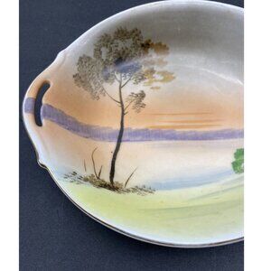 Vtg Meito China Bowl Dish Japan Hand Painted Landscape Lake 2 Handle 1930s 40s