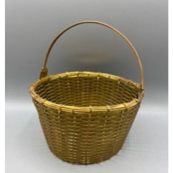 Durable and decorative, this handcrafted gold basket features a sturdy handle and versatile use for storage or display.