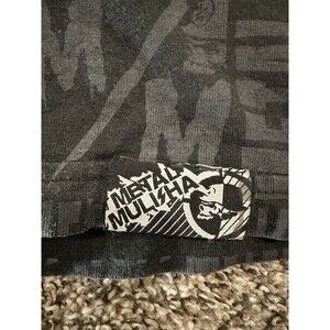 The product is a vintage Metal Mulisha men's shirt with a graphic print featuring an offroad, skull, and metal theme. Made of cotton, this black shirt has a round neckline, short sleeves, and a regular fit in size large. Produced in Mexico, this t-shirt is suitable for all seasons and is a stylish addition to any wardrobe for fans of the brand and its unique design aesthetic.